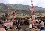 户撒阿昌族和傣族一样,普遍信仰小乘佛教。宗教节日有“进洼”、“出洼”、“烧白柴”、“泼水节”等。一些较大的村寨都有自己的佛寺、佛爷(大和尚),群众轮流供给饭食。群众供养佛爷以及宗教节日的布施,耗去大量的人力和物力,据仅有四十三户人家的芒弄寨的统计,全寨每年宗教支出约三万余斤稻谷,平均每户负担接近七百斤。梁河阿昌族,受汉族、白族的影响较多,祖先崇拜比较普遍,埋葬死者的墓地要请地师看风水,给死者树碑立墓,七月半也照附近汉族风俗给祖先“亡魂”烧纸钱等。但他们仍有自己的某些特点,如他们认为人有三个“魂”,人死后一个随尸体送往坟上,清明节祭它,一个供在家里,一个送回祖先发源地,多沿他们南迁的路线送往腾冲境内,近代已很少往北送,而是就地送往附近城院庙。阿昌族的村寨,一般都有一座庙,里边供奉山神、土地、孤寡仙人等。有少数寨子的庙里是供本民族的“寨头宫”,也有些寨子是山神、土地、寨头官(土主)同时供奉。对这些神每年祭献三次:二月祈求全寨清洁平安,五月祈求六畜兴旺,六月祈求五谷丰收。