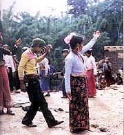圆圈舞是布朗青年最热衷的集体舞。跳舞时先由能 歌善舞的“冒少头”领舞,伴随着象脚鼓的节奏,姑娘们自动围成一圈,边跳边朝逆时针方向移动脚步。舞姿轻盈而优美。一群小伙子在里圈作虎步跳跃,他们时而分散与姑娘轻声对唱,时而聚合临摹动物行为舞蹈,如此反复循环,尽情抒发心中的喜悦。