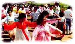在朝鲜族的家庭节日中,最隆重的是“回婚节”,亦称“归婚节”,即结婚6 0周年纪念日。谁家能举办回婚节,是种很大的荣耀,亲朋好友都要前来祝贺,一对老人穿上年轻时的结婚礼服,相互搀扶着入席,大家频频举杯祝福,比年轻人的婚礼更为热闹隆重。