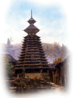 鼓楼是侗乡吉祥的象征,是侗乡人资兴旺,齐心团结的标志。鼓楼的造型有好几种,特别值得一提的是位于黎平县以西30公里的岩洞乡述洞村下寨的独柱鼓楼,当地人称它为“观星楼”,据说它的形状就是最早的鼓楼雏形。这种独柱鼓楼在整个侗族地区仅此一例,所以被人为重点文物保护。肇兴的鼓楼属专家归纳的密檐式——它集塔造型丰富,体形变化多样。底层四排十六柱,即组成底部四角重檐,上部八角密檐,而顶部为置鼓亭,六角密檐者形成六角攒尖。