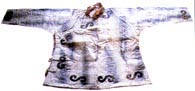 鱼皮袍 赫哲族的鱼皮衣服多用胖头、赶条、草根、鲩鱼、鲟、大马哈、鲤鱼等鱼皮制成,长衣居多,主要是妇女穿用。式样如同旗袍,袖子短肥、腰身窄瘦,身长过膝,下身肥大。领边、衣边、袖口、前后襟等处都绣有云纹或用染色的鹿皮剪贴成云纹或动物图案,风格淳朴浑厚、粗犷遒劲。早年衣下边往往还要缝缀海贝壳、铜铃和缨络珠琉绣穗之类的装饰品,更加别致美观。