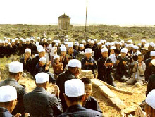 “开凡”。男人的“开凡”通常为三块,一块叫“皮拉汗”(波斯语坎肩之意)是覆盖前身的白布;一条叫“小卧单”,是垫在身下相当于褥子的白布;一块叫做“大卧单”,是在外层包裹整个“埋体”的白布。女人的“开凡”还要增加用做盖头和裹胸(也叫缠腰)的两块白布。举行转“费达”(赎罪)仪式。然后举行站“折纳孜”(殡礼)的仪式。殡礼主持人一般是有名望的阿訇。仪式开始时,将“埋体”置于“塔布提”匣子中(一种底层可以抽拉的无盖的大木匣子),抬到葬地,置于墓穴之上,头北面西,主持仪式的阿訇为亡人祈祷,并带领大家念“赞主词”三次。仪式后,即送“埋体”入坟,葬穴为长2米,宽1米深约2米的直坑,在直坑底部向西侧挖一洞(以平放遗体为限)。当埋体按照教规放入洞内后,再将洞门用土坯封住,并用黄土填满直坑,地面用砖、土筑成脊形坟墓。与此同时,在送“埋体”的沿途中,要为亡人散“乜贴”,数额大小不等,根据家庭条件而定。并将亡人衣物散给洗尸人员和亲友,有的还要给前来送“埋体”的众人散白帽戴孝。亡人葬后逢七、二七、三七、四十天、百日、周年、三年、十年,都要请阿訇念经,表示纪念。