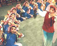 自如。经常弹奏的曲调有:"廊檐滴水" 、 "骆驼铃""珍珠倒卷帘"等。回族妇女还喜欢在口弦上系上五色的丝穗子、珠子等装饰品,不弹时挂在衣服纽扣上,这既是爱美的表示,又是有音乐才能的显示。姑娘们用这种简单小巧的乐器,传情达意、弹唱歌谣,丰富文化生活。回族人民喜欢唱高亢、婉转、动听的民间高腔山歌----"花儿"。当你来到六盘山区和同心、盐池一带,无论是在盘山的羊肠小道上,牧羊的山坡上,还是在拔草的麦田里,打谷的禾场上,以及在