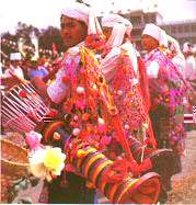 馈赠礼仪 在人际交往中,景颇族喜欢以礼篮相赠。礼篮,景颇族称为“俪”,是一只藤篾篮子,经过巧妙的装饰之后,里面装一筒白水酒,一筒煮米酒,两包熟鸡蛋,两包糯米团。各件礼品皆有寓意,竹筒中的酒分别代表男女两性,水酒表示女性,米酒表示男性;糯米饭表示亲密、友谊和团结;鸡蛋表示纯净、美好,祝福平安。赠送和接受礼篮时,有规定的礼仪:先拜见主人家的长者,卸下礼篮,将篮中礼品当面清点;主人接受礼篮后,长者当面祝词表示欢迎和感谢,然后当着大家的面首先饮酒,并将糯米饭团分给众人,把鸡蛋切成片,放在饭团里一起吃。