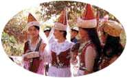 未婚女子 柯尔克孜族未婚女子关戴红色金丝绒圆顶小花帽或用水獭、旱獭皮做的枯珠子、缨穗、羽毛的红色大圆顶帽,身穿连衣裙或带褶长裙,也有穿不带褶的长裙,裙外罩一件国上用丝线绣有各种图案花纹、缀有银扣或铜钱,色彩绚丽的金丝绒坎肩。