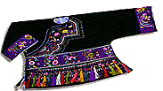 苗族服装大多遍施图案,刺绣、挑花、蜡染、编织、镶衬等多种方式并用,做工十分考究,令人眼花缭乱。尤其从刺绣图案中往往可以寻出苗族的历史和象征意蕴,可谓是“有意味的形式”。例如,文山“花苗”,在其黑色圆领斜襟窄袖衣的领边、袖肘绣有红、黄、蓝、白等花纹,纹路多呈花状、江水状,据说这些花纹象征着苗族祖先所居之地:红、绿波浪花纹代表江河,大花代表京城,交错纹代表田埂,花点代表谷穗。禄劝、武定、安宁一带的大花苗爱披加花披肩,上绣三道方形图案,与苗族古歌上“格蚩尤老练兵场广花三道”的说法正相符,所以,传说它象征古代的练兵场和令旗,披肩两头的花纹代表过去京城的城市和街道……这些服饰的来由,大多与上古九黎三苗与黄帝逐鹿中原,战败后从黄河流域退到长江,又退到云贵高原的历史有关。因而,苗族的衣装图案并非每个能织会绣的男女都可以随心所欲地织绣,什么地方饰什么图案,什么图案表示什么,什么身份年龄的人该饰什么图案,都有严格的规定。