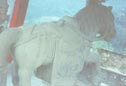 均系巨石雕刻,明万历三十九年(1611年),土司覃鼎夫人田氏和洞主覃桔杰,为纪念土司主覃鼎出征功绩,建造石人石马各一对,左右并立。石马势若奔驰,石人执辔其旁,有即将出征之势。马身雕饰鞍、蹬、缰、辔;马倌着盔甲,佩剑带伞,持缰侍立马旁。有诗曰:“石马石人在浪舟,大仙留下几千秋。青草齐眉难开口,黄尘满面起兜鏊。狂风呼呼无毛动,细雨霏霏似汗流。牧童有绳牵不走,狂鞭怒打不回头。”