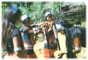 订婚 通过“串姑娘”,男女确定恋爱关系后,便由男方向女方求婚。男方的两位长者陪同一老妇去姑娘家,先递上礼品,如姑娘的父母收下礼品,则表示同意举行订婚仪式。