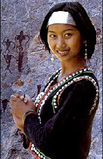 女子服饰 妇女的服装一般是上着衣,下穿裙子。她们的裙子独具特色,是用一幅布围起来的裙子,她们留长发,不梳辫子,戴银箍或竹制的发圈,将头发拢在后面。耳朵上戴有银制大耳环,颈脖上戴数个银项圈和若干串料珠,腰间戴有若干竹圈,有的用黑漆漆过。有的上刻花纹,