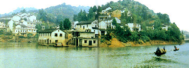 深渡之下,两岸青山夹峙,形成江流峡谷,山映江中,山青水碧。江畔居民,层层排排、错落有致。沿岸有正口、溪口、街口三个重要乡埠,俗称“三口”。三口地区,柑桔林成片连坡,到了秋天,“三口”蜜桔熟了,桔红叶碧,恰如绿帷上闪灼着红星星。一出街口,江水淼淼,已成高峡出平湖之势,那就到了浙江地界。