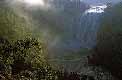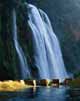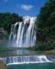 黄果树瀑布落差74米,宽81米,河水从断崖顶端凌空飞流而下,倾入崖下的犀牛潭中,势如翻江倒海。水石相激,发出震天巨响,腾起一片烟雾,迷蒙细雾在阳光照射下,又化作一道道彩虹,幻景绰绰,奇妙无穷。瀑布对岸高崖上的观瀑亭上有对联曰:“白水如棉不用弓弹花自散,虹霞似锦何须梭织天生成”,此乃是黄果树瀑布的生动写照。但黄果树瀑布的形态因季节而有变化,冬天水小时,它妩媚秀丽,轻轻下泻;到了夏秋,水量大增,那撼天动地的磅礴气势,简直令人惊心动魄。有时瀑布激起的雪沫烟雾,高达数百米,漫天浮游,竟使其周围经常处于纷飞的细雨之中。