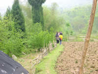 拂面的微风携着青草的气息在空气中轻轻游荡,没有飞扬的尘土,也没有刺鼻的油烟。从月亮山庄起身,看对面那座不知名的山上,一股轻雾从两个驼峰一样的山之间流下来,在山谷间弥漫,扩散;山庄旁边的田里,嫩绿的秧苗从脚下一直向前延伸,直到在晨雾的掩饰下,与远山溶为一体。