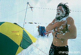 左图:Victor边用冰雪洗澡,边唱到:“冰雪让我到东、冰雪让我到西...”