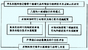 根据以上目标,以六道沟流域为主体,进行试验与示范。开展了水蚀风蚀时空特征及防治措施合理配置、基本农田优化利用结构和高效农业综合技术及水蚀风蚀逆境下植被优化结构和建造技术体系配置子模式的研究,同时进行生态经济效益监测和评价,在此基础上构成其综合治理模式(图 1)。